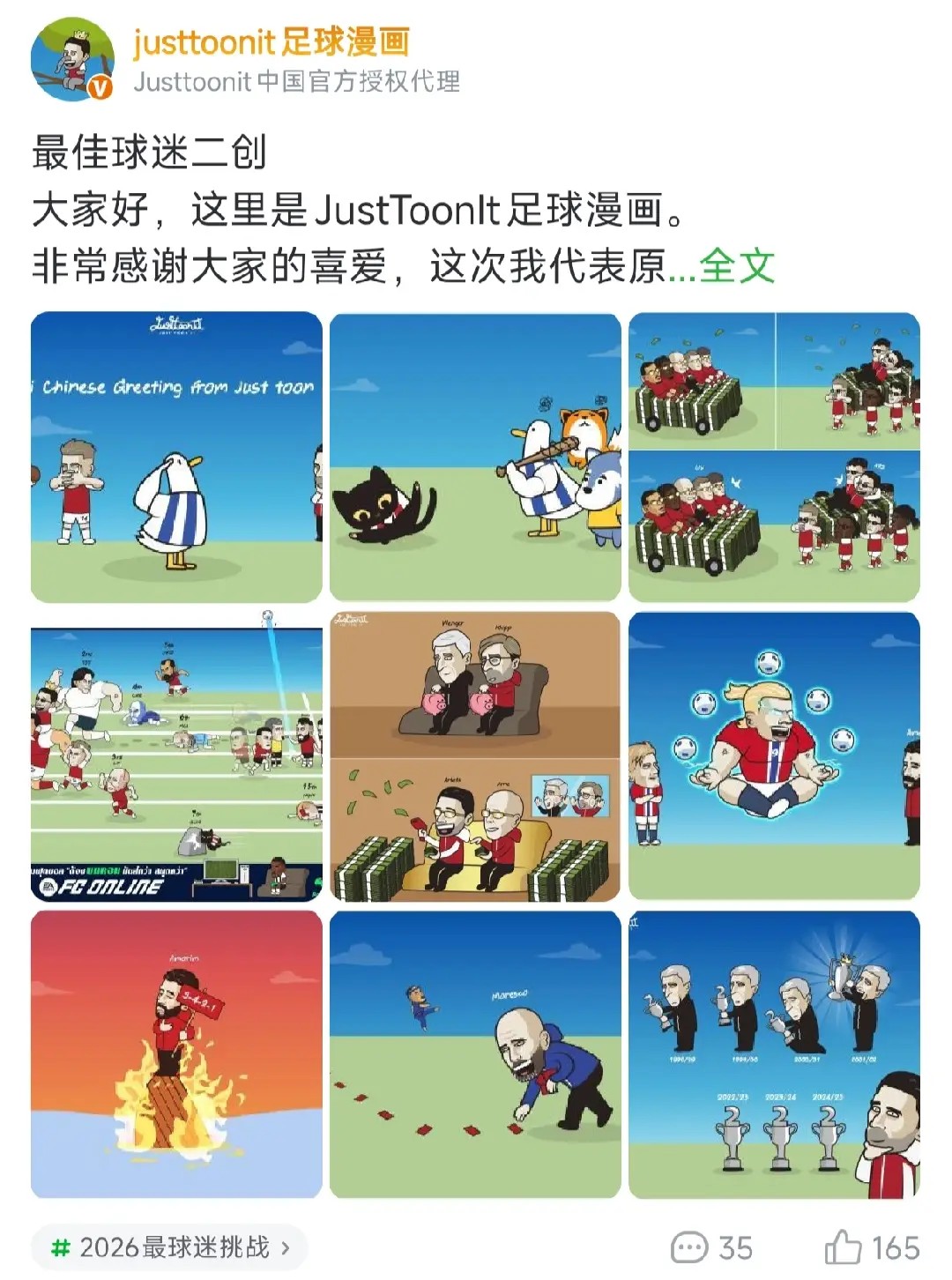 #2026最球迷挑战预赛阶段圆满收官!【最佳球迷二创赛道】上,各路创作高手各显神通,用天马行空的创意与巧思,诠释了球迷独有的艺术表达。经过层层甄选,6位二创候选者成功晋级决赛投票环节。一睹他们的精彩创作,为你心中的【最佳球迷二创】投出一票吧!候选者名单候选者1:@justtoonit足球漫画他的画笔跨越赛果、追踪动态:有战术,有梗图,陪伴大家走过每一场英超比赛点击查看原帖>>候选者2: